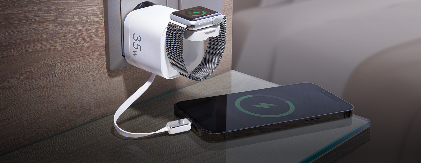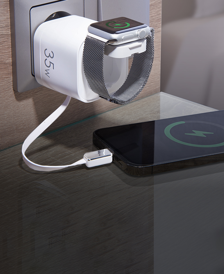 Rare et incroyablement pratique : l’adaptateur de charge 4-en-1 avec câble USB-C intégré et station de charge Qi.