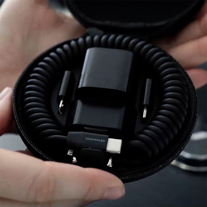 Kein lästiges Kabelwirrwarr. Und immer den richtigen Ladeanschluss dabei. Griffbereit im kompakten Taschenetui.