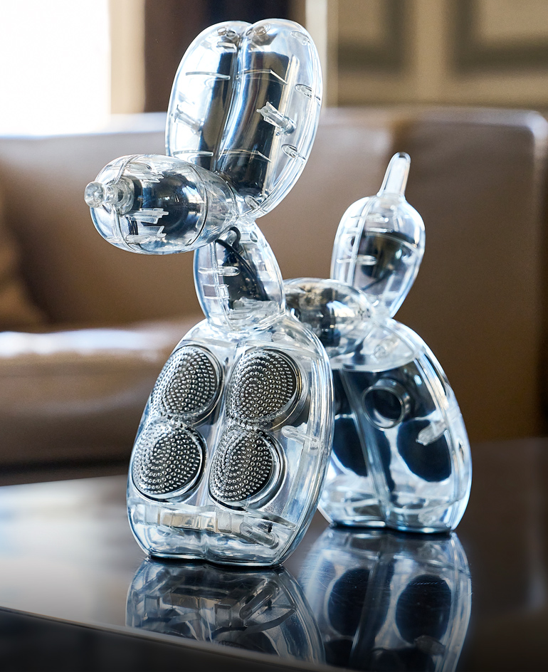 La sculpture emblématique Balloon Dog de Jeff Koons, réinterprétée sous la forme d’une enceinte spectaculaire.