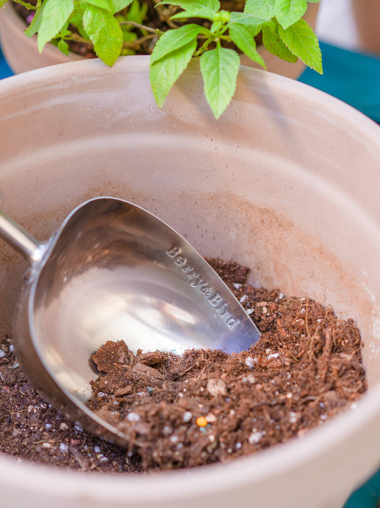 Person bearbeitet einen Blumentopf mit einer Substratschaufel.